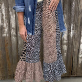 Our Leopard Combo Ruffle Pants deliver a plane to pool vibe! These beauties are comfortable enough to wear for travel due to their wide pant leg and structured waist. Irregular leopard prints all over the pants. The ruffled hem is particularly eye-catching. Styled with the casual denim shirt!